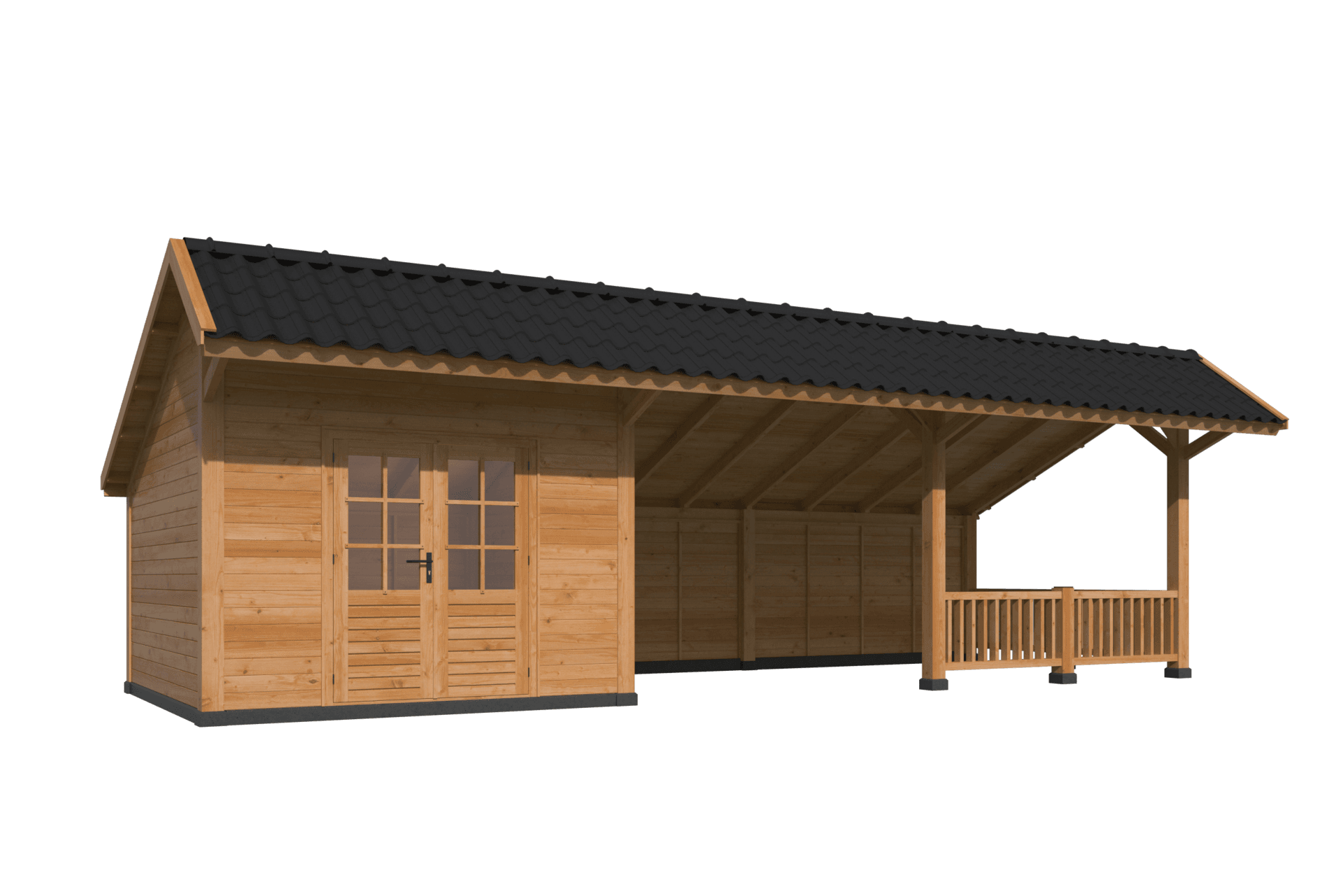 Op zoek naar een royale overkapping met een landelijke uitstraling en veel mogelijkheden? Deze kapschuur van bijna 10 meter lang is gemaakt van A-kwaliteit, gedroogd Douglas hout en voorzien van enkel glas in deur en raam. Het ideale project voor de handige doe-het-zelver met oog voor stijl en ruimte.
