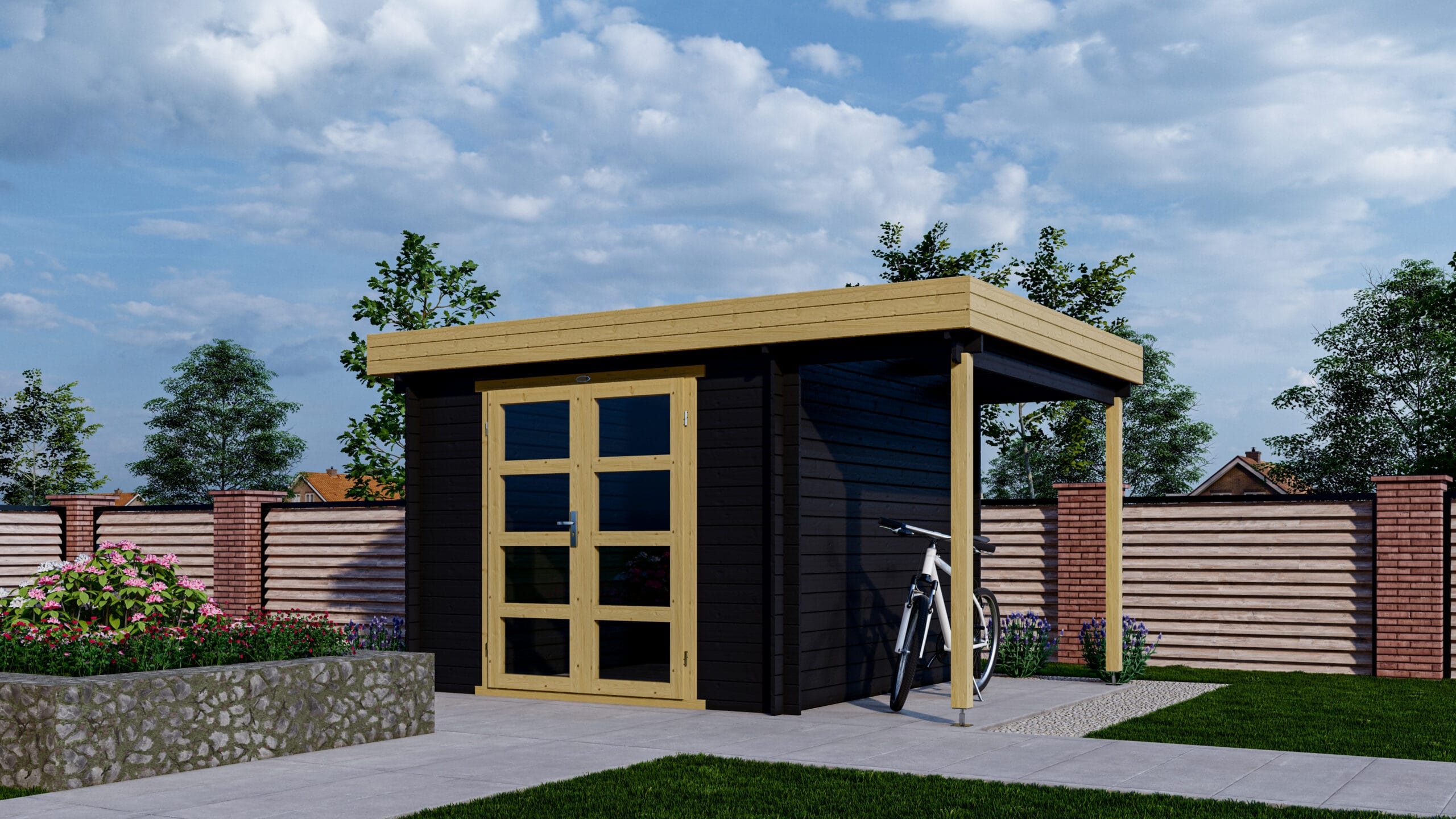 Op zoek naar een moderne blokhut met plat dak van ca. 3 x 3 meter met kleine overkapping aan de zijkant? Blokhut 331M van Interflex is uitgevoerd met een basis berging van 300 cm breed, 300 cm diep en een hoogte van 230 cm. Naast de basis berging van 3 x 3 meter bevindt zich een zijluifel / overkapping met een breedte van 110 cm. Kortom, met model 331M van Interflex haalt u blokhut in huis met een fijne ruimte voor het opbergen van bijvoorbeeld uw tuingereedschap en een kleine overkapping die ruimte biedt voor het overdekt stallen van een fiets of voor het opstappelen van haardhout. De overkapping van blokhut 331M kan naar keuze aan zowel de linker- als rechterzijde worden geplaatst van de basis berging.