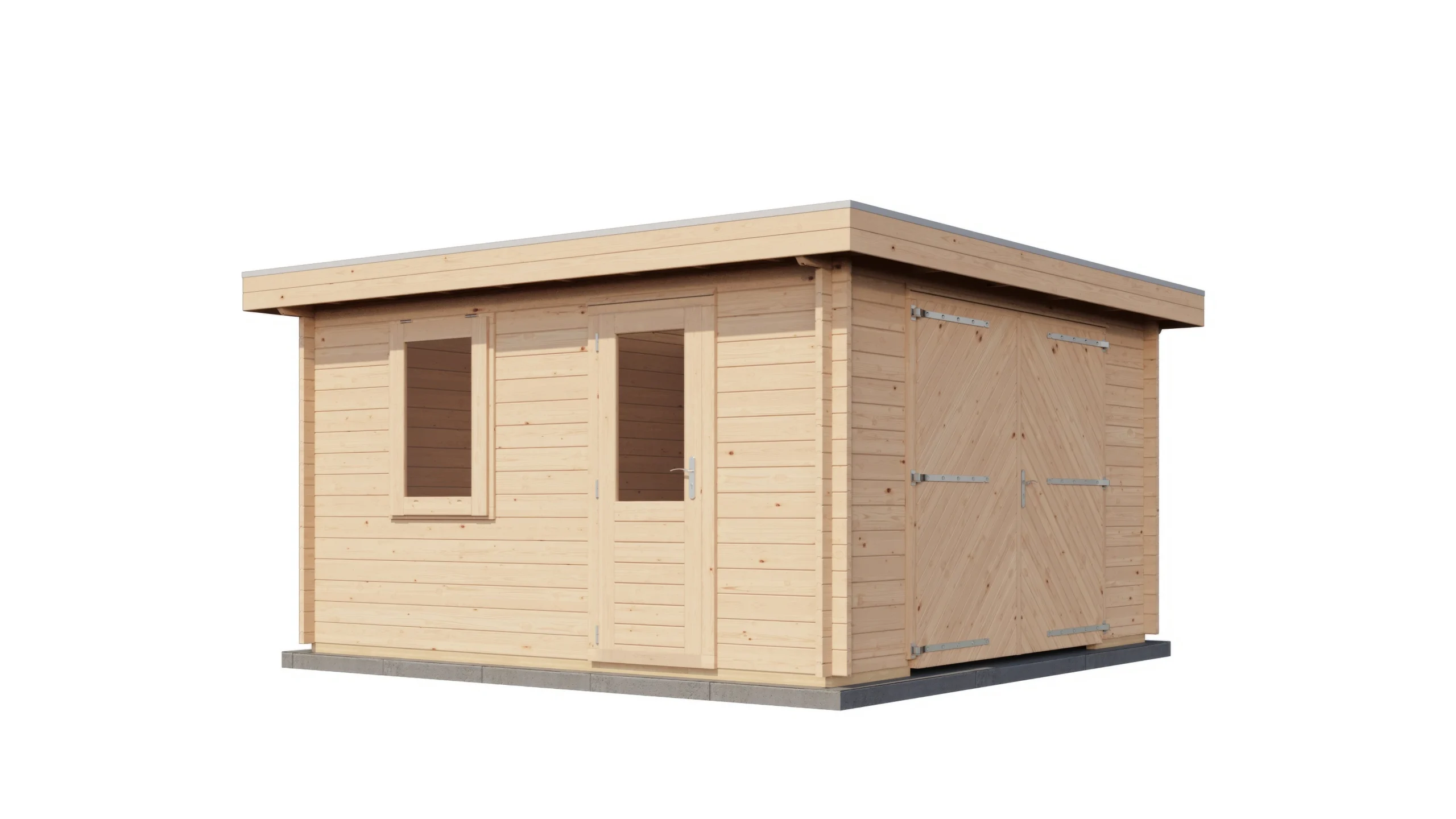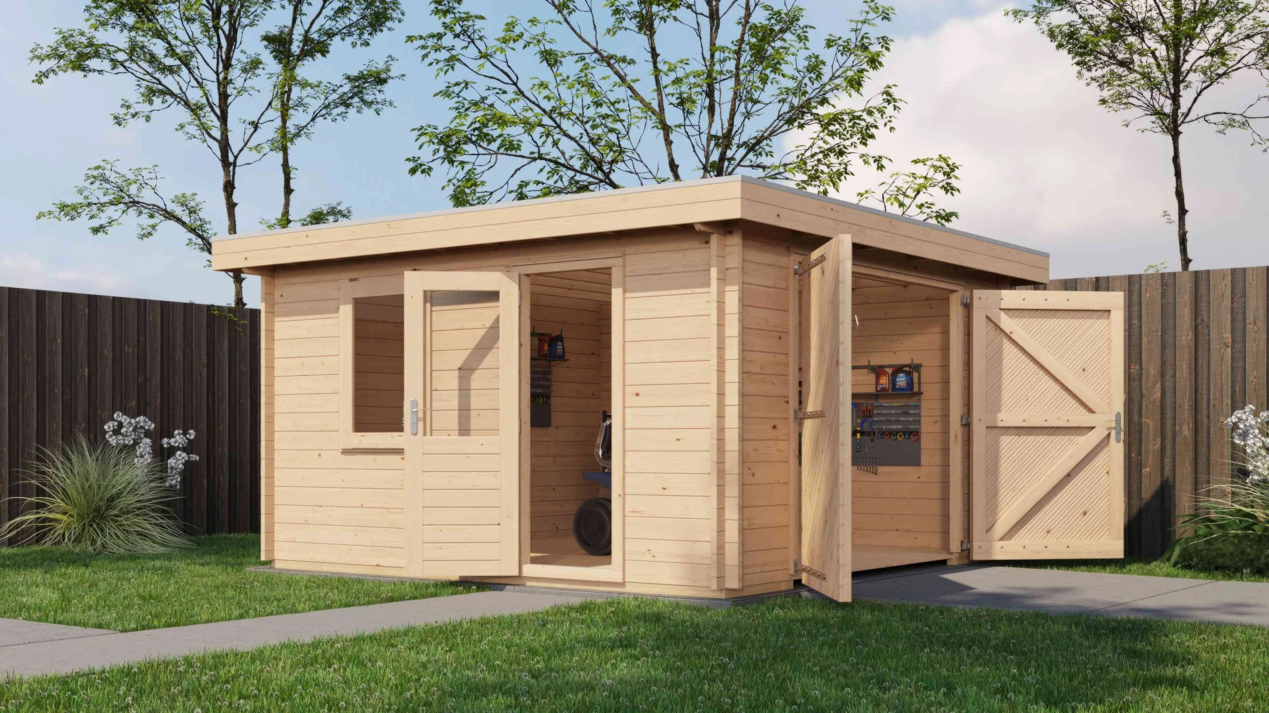 De Blokhut Groenlo van 400×400 cm is een ruime en robuuste toevoeging aan je tuin. Dankzij de dubbele garagedeur biedt deze blokhut niet alleen voldoende ruimte voor opslag, maar ook voor het stallen van voertuigen of grotere spullen. Gemaakt van 44 mm 1e klas gedroogd vurenhout, garandeert deze blokhut een extra stevige en duurzame constructie. De dakplanken van 18 mm met veer en groef vormen een solide dakstructuur (EPDM niet inbegrepen), terwijl het dubbelglas in de ramen extra isolatie en een nette afwerking biedt. De blokhut beschikt bovendien over een dubbele deur en een uitzetraam van gelamineerd hout van 4,5 cm dik. Alle benodigde beslag en ijzerwaren zijn inbegrepen, zodat de montage eenvoudig en compleet is.