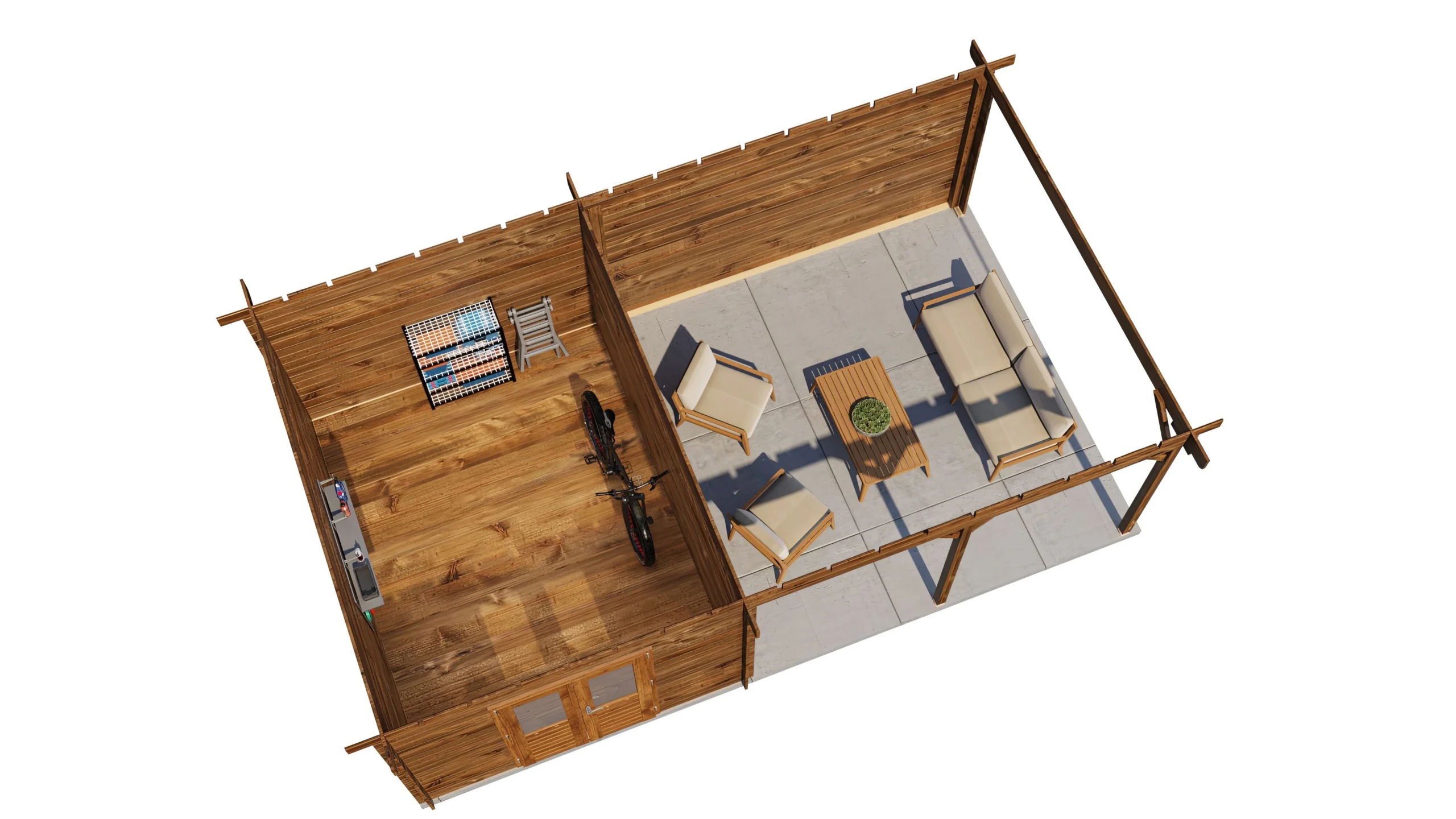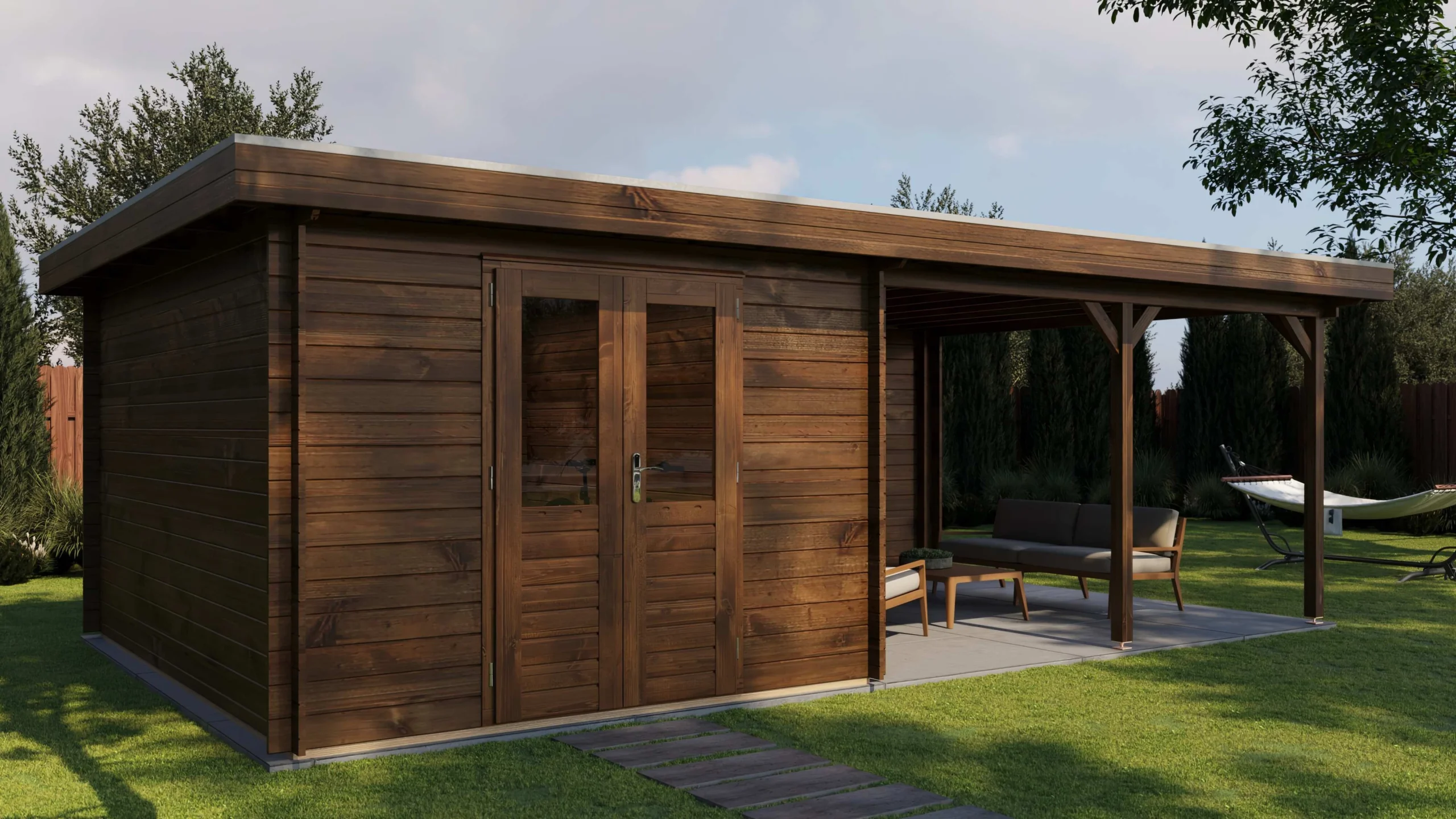 Deze blokhut is vervaardigd uit 28 mm 1e klas gedroogd vurenhout, wat garant staat voor een stevige en duurzame constructie. Het dak bestaat uit 18 mm dakplanken met veer en groef (EPDM exclusief). De dubbele deur van gelamineerd hout (4,5 cm dik) met dubbelglas zorgt voor extra stevigheid, veel lichtinval en een luxe uitstraling. Alle benodigde beslag en ijzerwaren zijn inbegrepen, zodat de montage volledig en eenvoudig is.