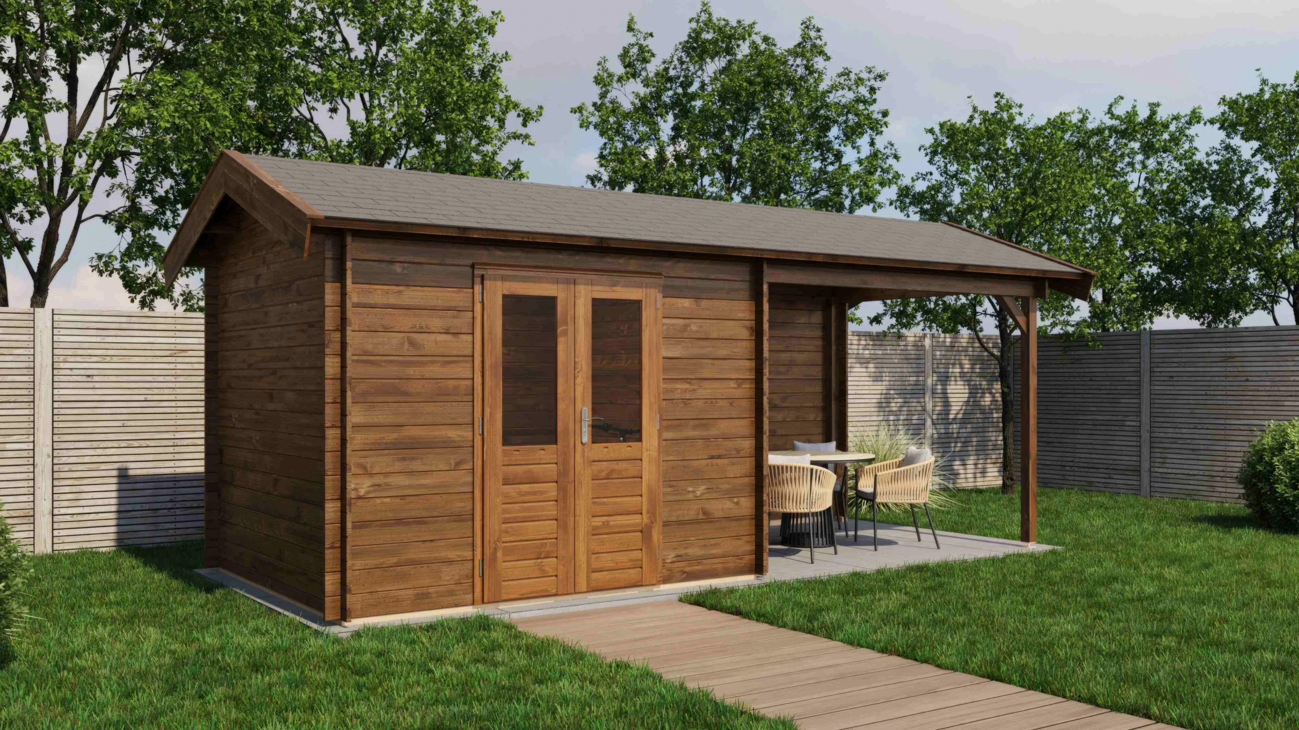 Praktische combinatie van blokhut en overkapping
