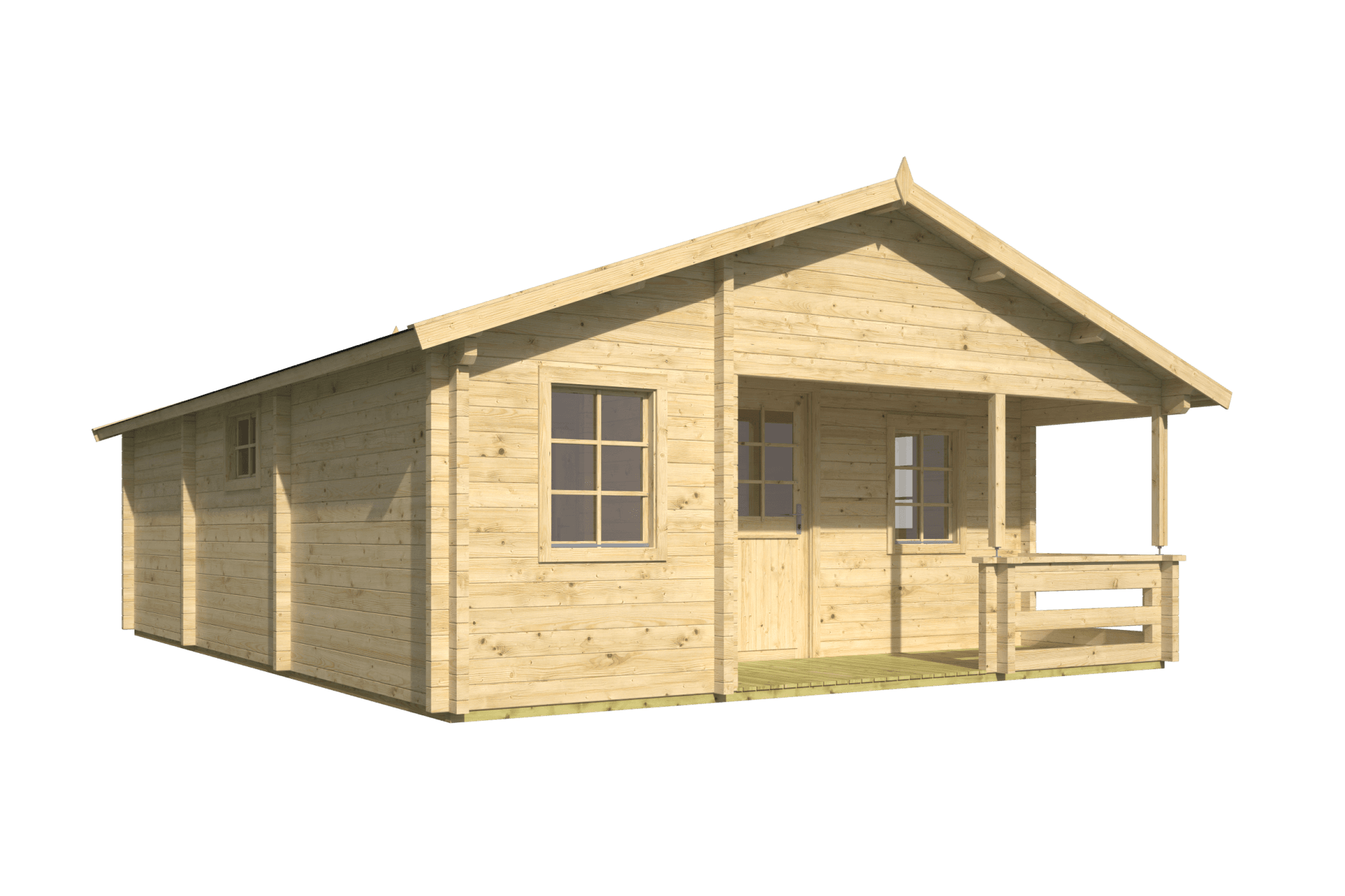 Deze royale houten blokhut biedt ultieme veelzijdigheid, een warme uitstraling en hoogwaardige afwerking. Met een vloeroppervlakte van 44,8 m² verdeeld over vier ruimtes, is deze blokhut ideaal als tuinkantoor, gastenverblijf, atelier of opbergruimte. De zijwaartse overkapping van 5,3 m² voegt een beschutte buitenruimte toe – perfect voor een zitplek of als afdak voor fietsen of tuingereedschap.