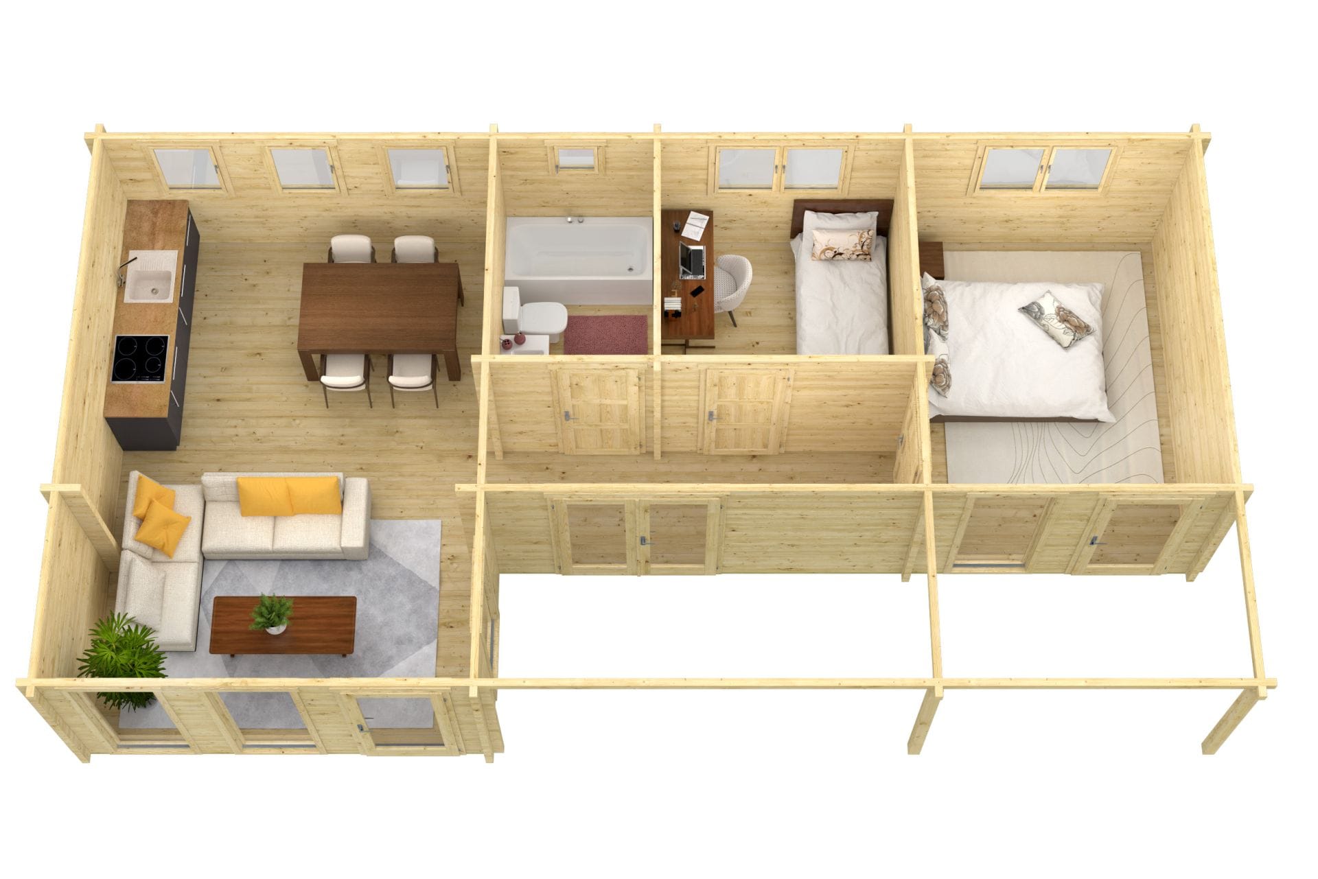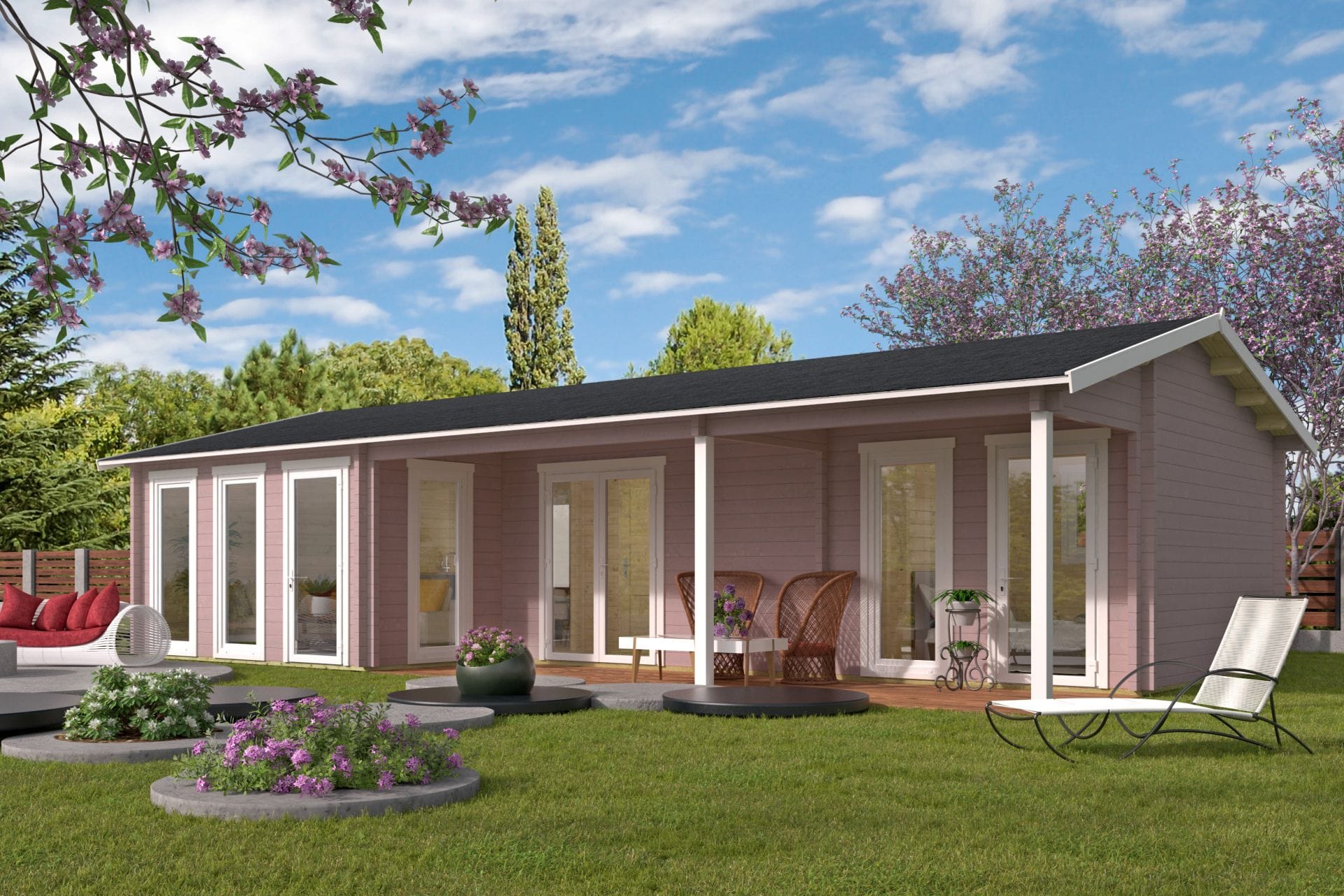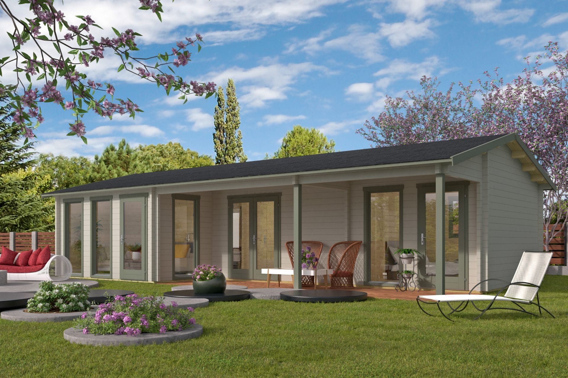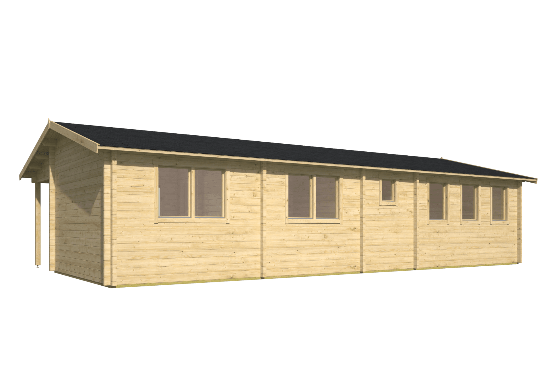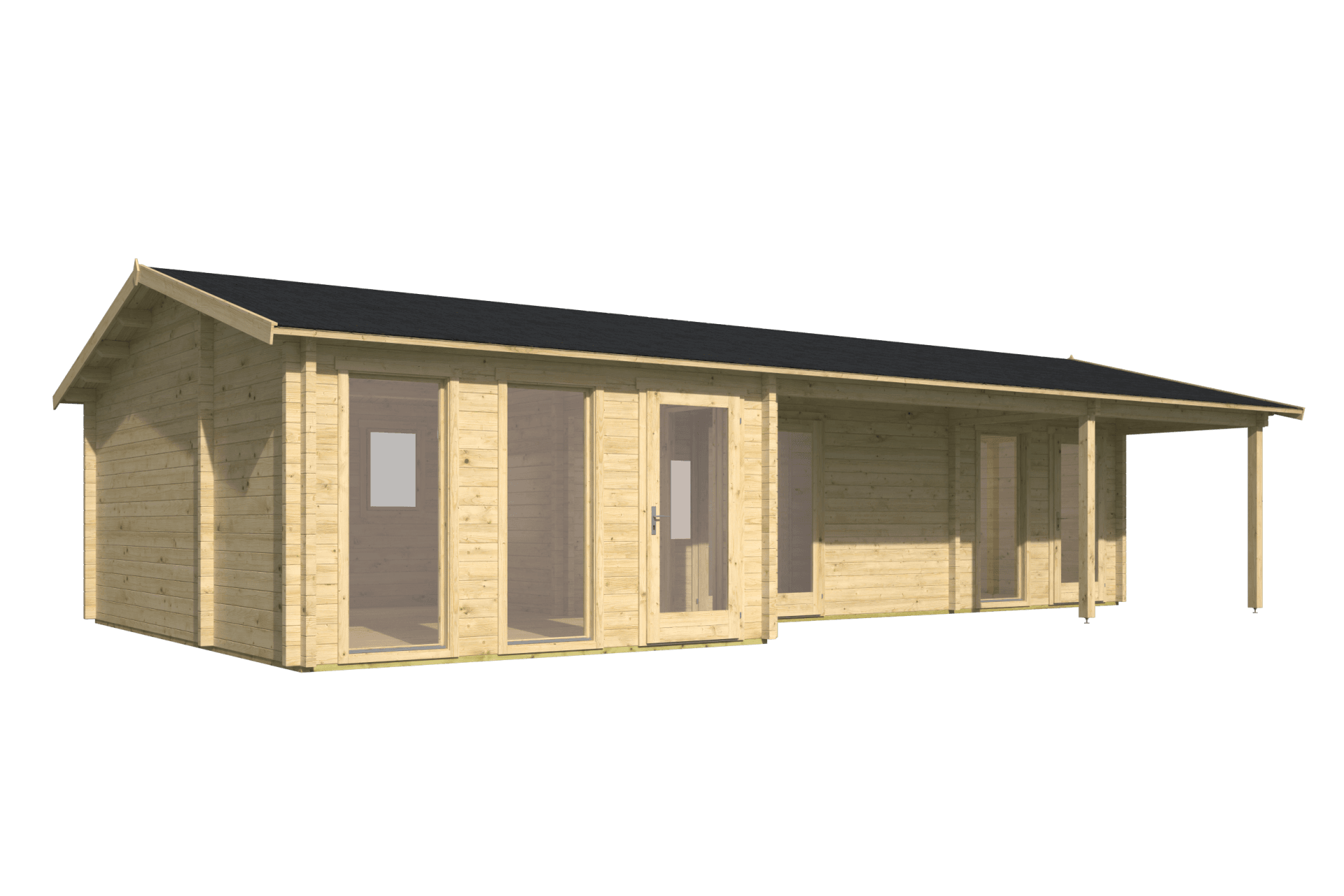 Deze royale houten blokhut met klassieke zadeldakconstructie en voorzijde overkapping biedt ruimte, comfort en hoogwaardige afwerking. Met een indrukwekkend vloeroppervlak van 46,6 m², een overkapping van 12,3 m² en maar liefst 4 afzonderlijke ruimtes, is dit verblijf uitermate geschikt als tuinkantoor, gastenverblijf, hobbyruimte of combinatie daarvan.