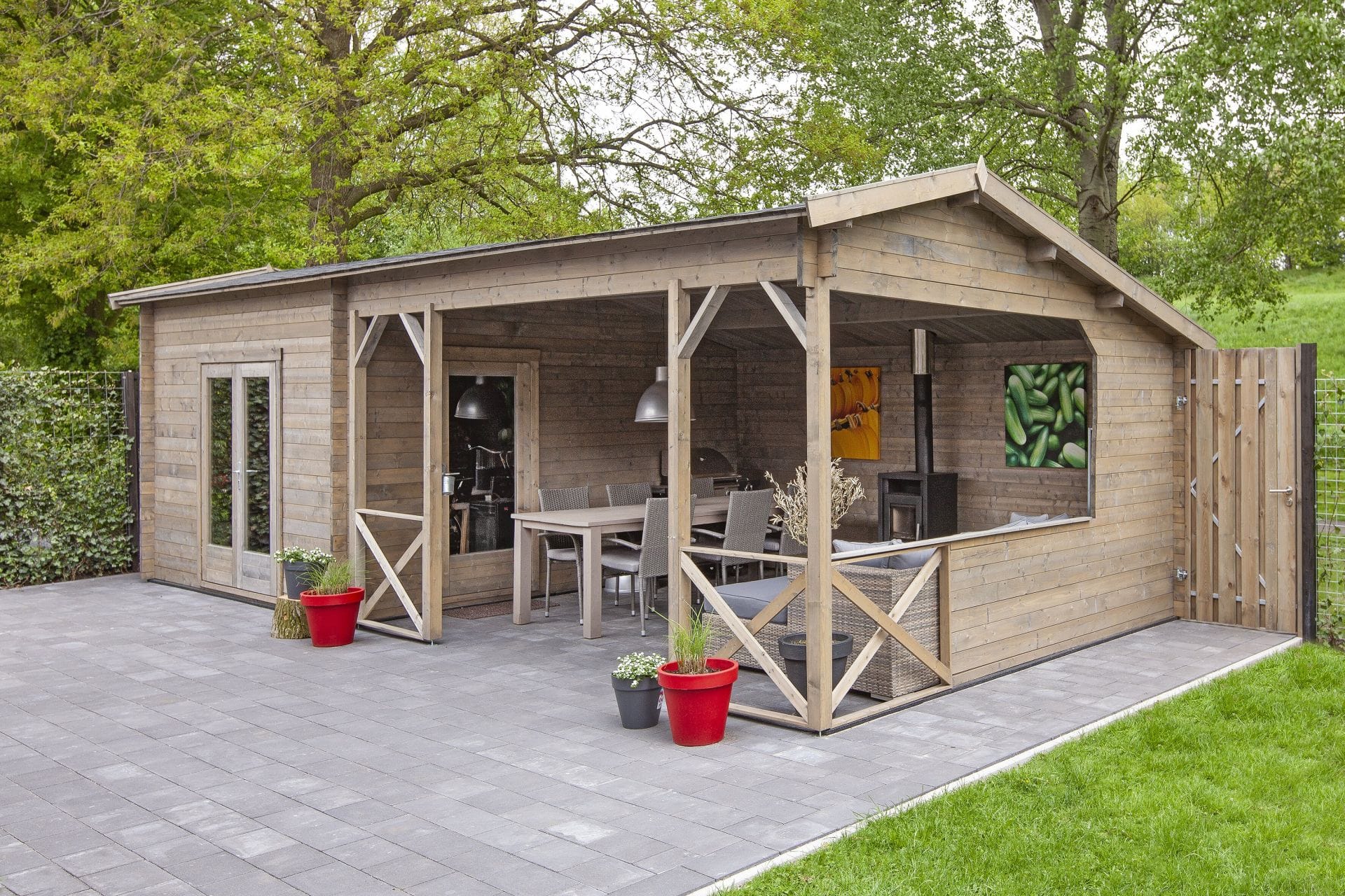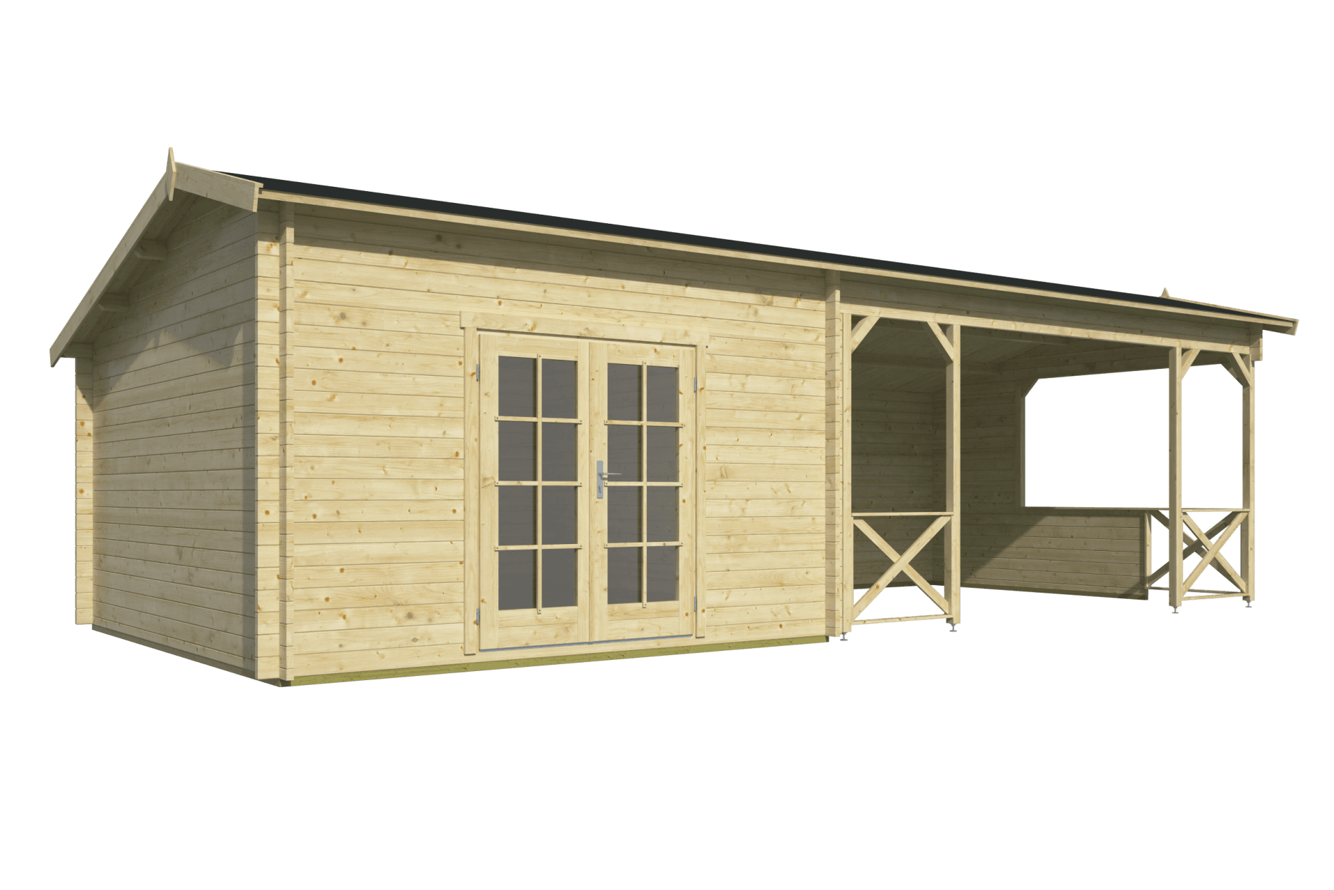 Breng stijl, sfeer en functionaliteit samen in uw tuin met dit charmante houten tuinverblijf voorzien van een karakteristiek kapschuurdak en royale zij-overkapping. De combinatie van een afgesloten ruimte van 13,8 m² en een overkapping van 18,4 m² biedt volop mogelijkheden voor opslag én buitenleven onder één dak.