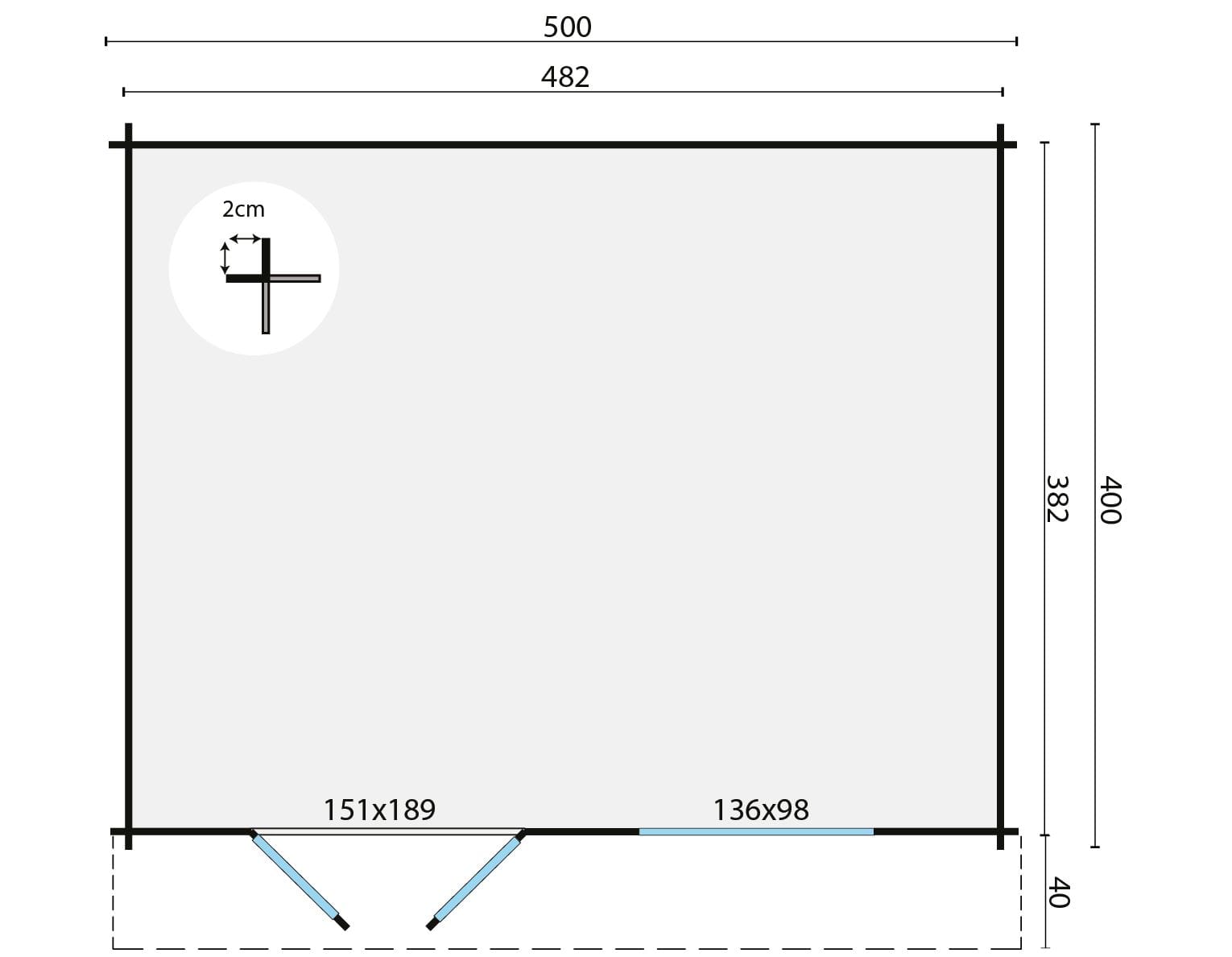Totale afmeting (incl. dakoverstek): 500 x 400 cm