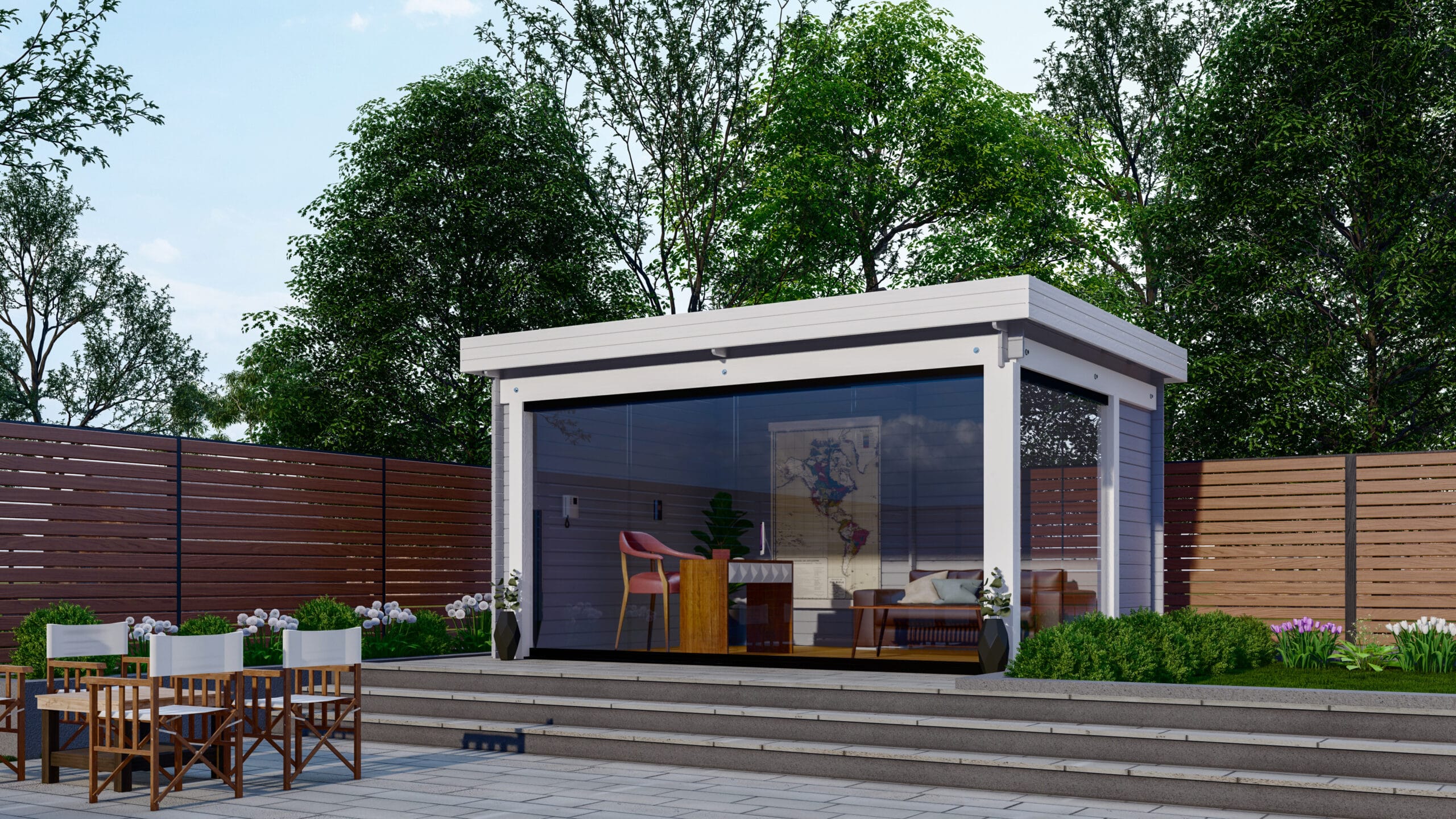 Deze moderne overkapping beschikt over luxe glazen schuifwanden die bestaan uit meerdere schuifbare glazen panelen die eenvoudig in zijn geheel of deels zijn te openen. Hierdoor creëert u in een handomdraai een open of gesloten tuinverblijf waar u ongeacht de weersomstandigheden kunt genieten van uw tuin. Omdat deze houten tuinverblijf met plat dak veel lichtinval biedt en geheel is af te sluiten, leent Overkapping G4434 MG van Interflex zich ook uitstekend als Tuinkantoor.
